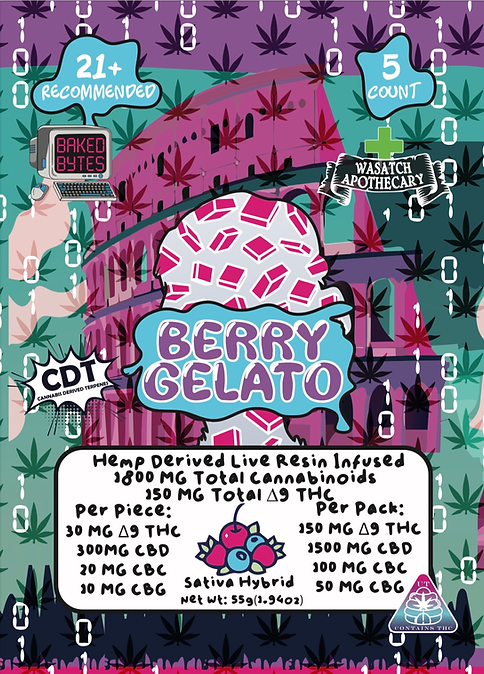 Berry Gelato is a hemp derived live resin infused with 1800 MG Total cannabinoids with 150 MG Total Δ9 THC. Sativa Hybrid with 5 gummies.